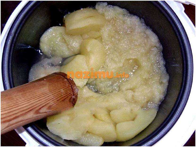 Немного охлажденные яблоки нужно измельчить. Для этого стоит использовать блендер, или деревянную толкушку.