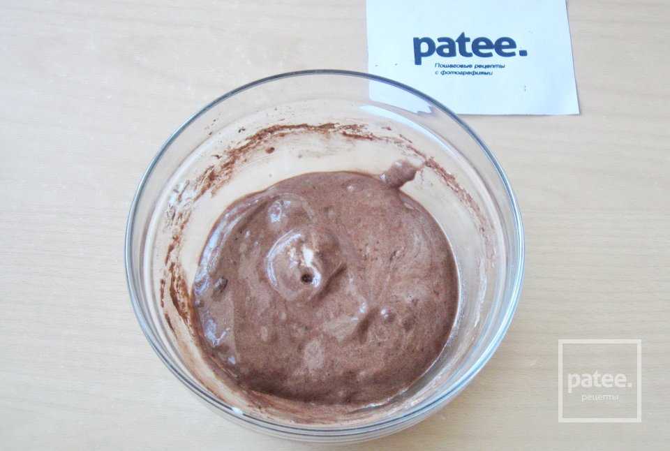 От общего количества теста перекладываем 3-4 столовые ложки в отдельную посуду. Добавляем две чайные ложки какао-порошка и перемешиваем.