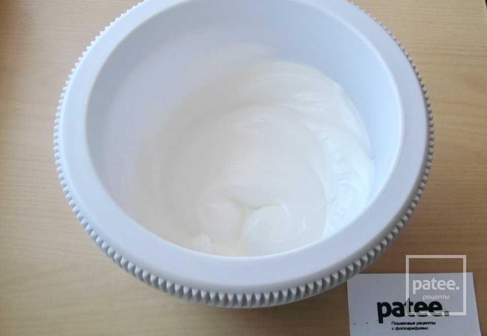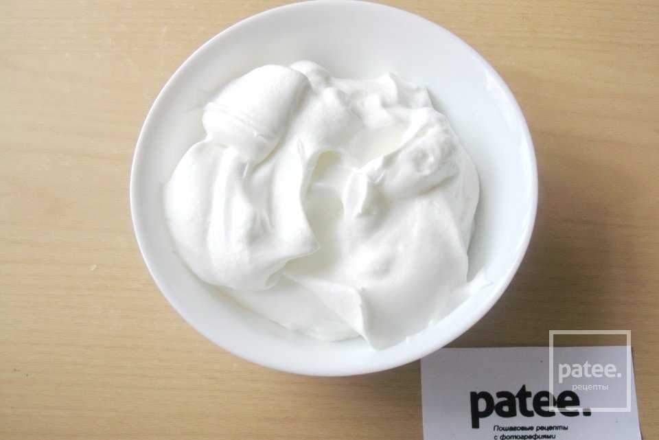 Отдельно взбить белки со щепоткой соли. Можно вместо соли добавить лимонную кислоту (щепотку) и взбивать до легкой пены. Затем в несколько приемов ввести весь сахар, не переставая взбивать. Белки должны держать плотные пики.