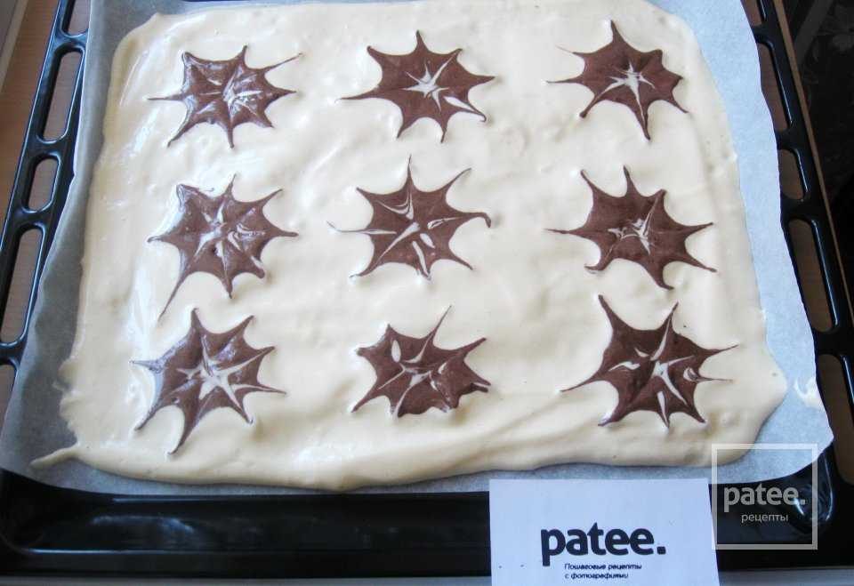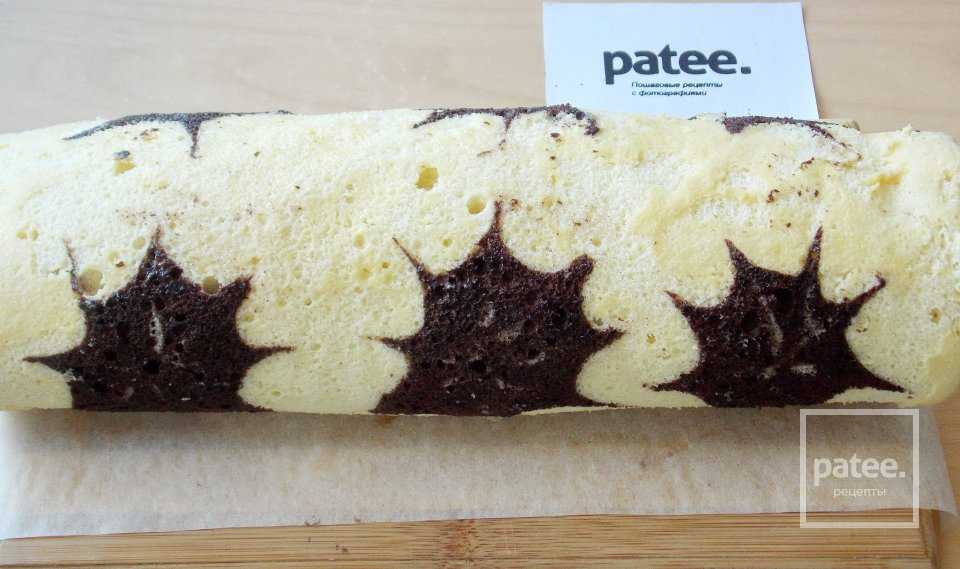 Зубочисткой рисуем звезды из теста с какао. Ставим в духовку, разогретую до 180 градусов и выпекаем 8-10 минут. Готовый бисквитный корж достаем из духовки, выкладываем на полотенце и снимаем бумагу для выпечки.