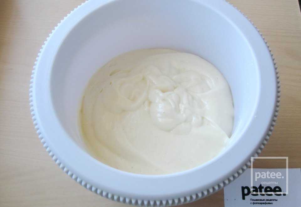 К полученной массе добавить четыре желтка и снова все хорошо размешать ручным венчиком. Должно получиться однородное и гладкое желтковое тесто.