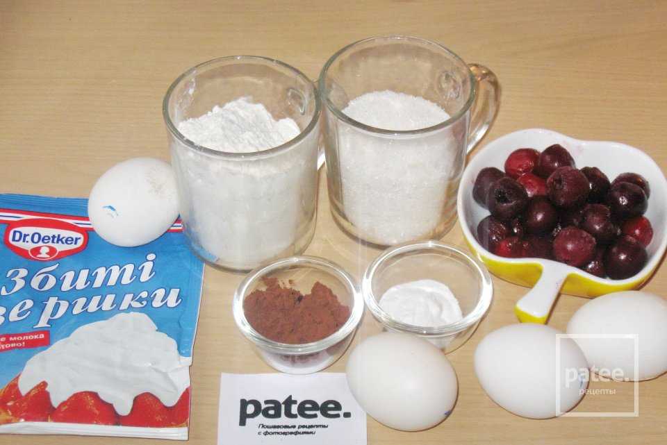 Для приготовления бисквитного рулета с кремом и вишней нужно взять: яйца, сахар, муку, разрыхлитель для теста, какао, вишню без косточек, сливки для взбивания.