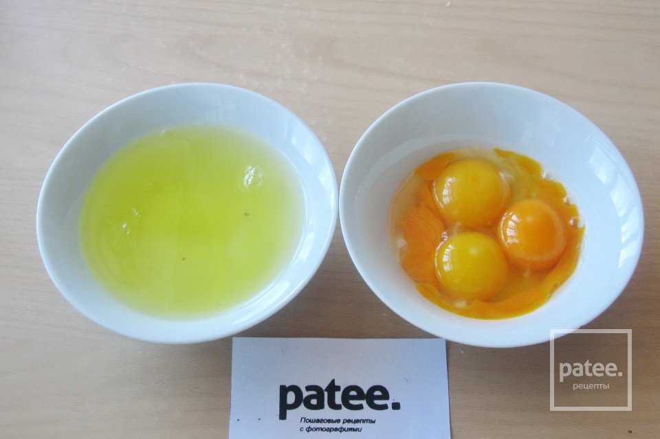 У яиц отделяем белки от желтков. Нужно взять три крупных или четыре средних куриных яйца.