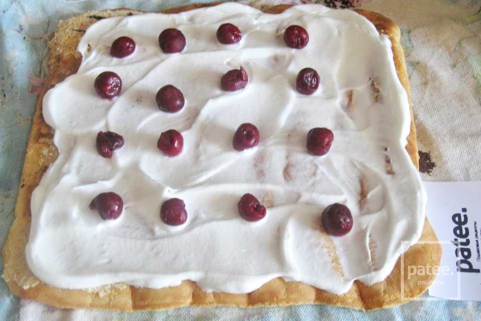 Бисквитный корж осторожно развернуть и сбрызнуть вишневым соком. Смазать обильно бисквит взбитыми сливками и сверху разложить на нем вишню