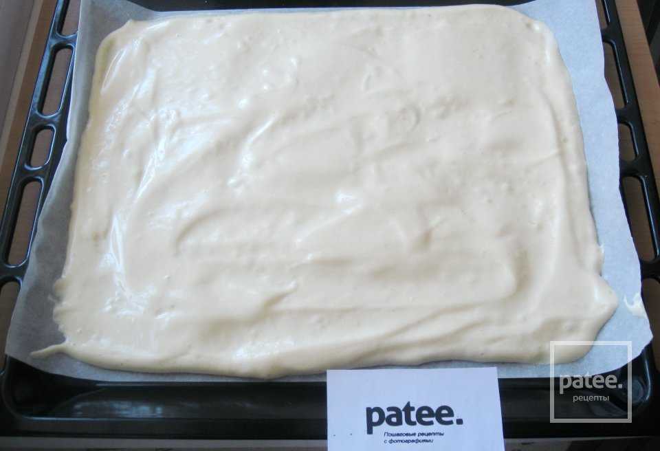 Выложить бисквитное тесто на противень, на бумагу для выпечки, смазанную маслом.