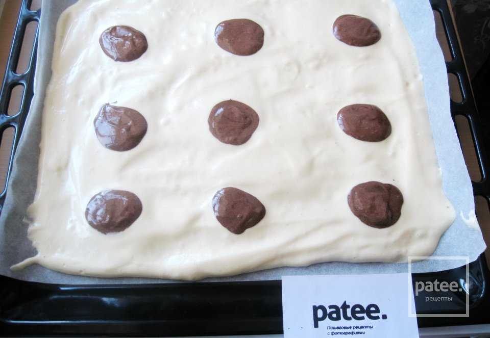 Сразу перелить тесто на противень, застеленный пергаментом. Выпекать в разогретой до 180С духовке 8-10 минут.