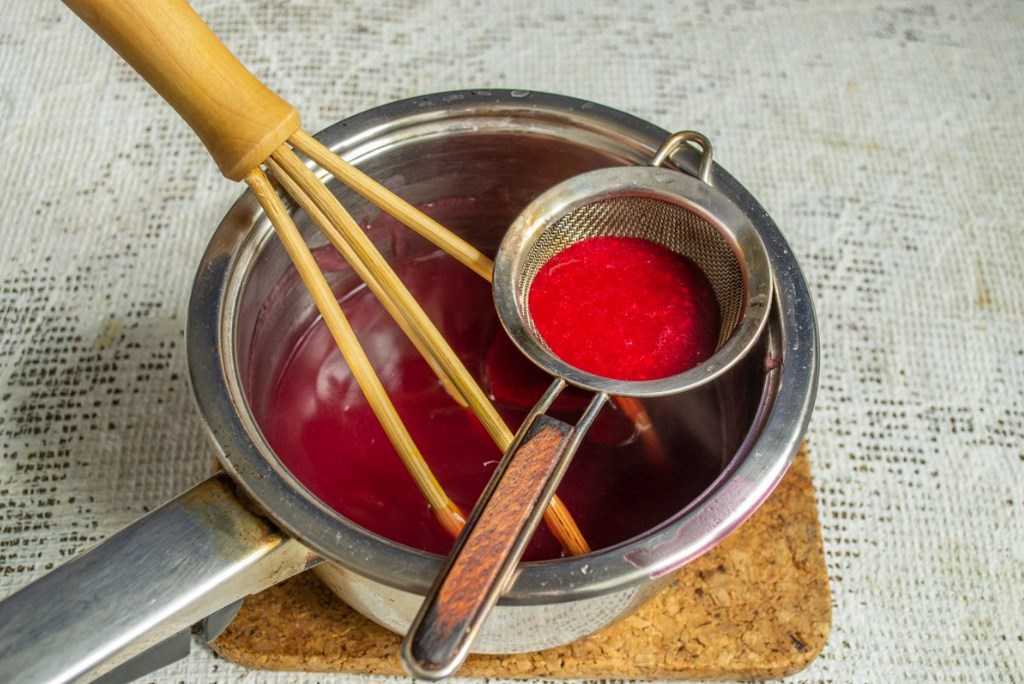 - Чуток остудите, затем избавьтесь от косточек. Процесс несложный: можно протереть ягодки через сито, или выстелить дуршлаг марлей и протереть через неё. Жмых можно выбросить, он не пригодится.