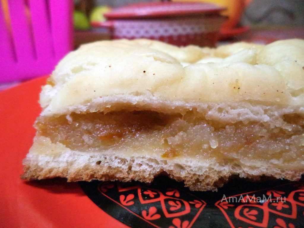 - Стол для раскатки и скалку посыпать мукой. Раскатать тесто в прямоугольник. Перенести его на противень или бумагу для выпечки (с начинкой переносить труднее).
