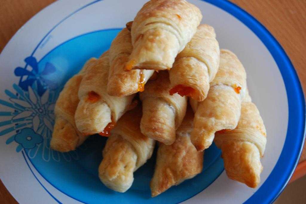 Такие слойки можно за неимением варенья приготовить со свежими ягодами или фруктами, но тогда вам также понадобится крахмал для того, чтобы сладкая начинка не вытекла, кусочки ягод были скреплены между собой.
