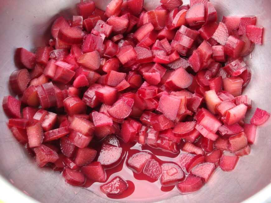 - Чистые стебли ревеня нарезать кусками. Засыпать сахаром и отставить на 8 часов для получения сока.