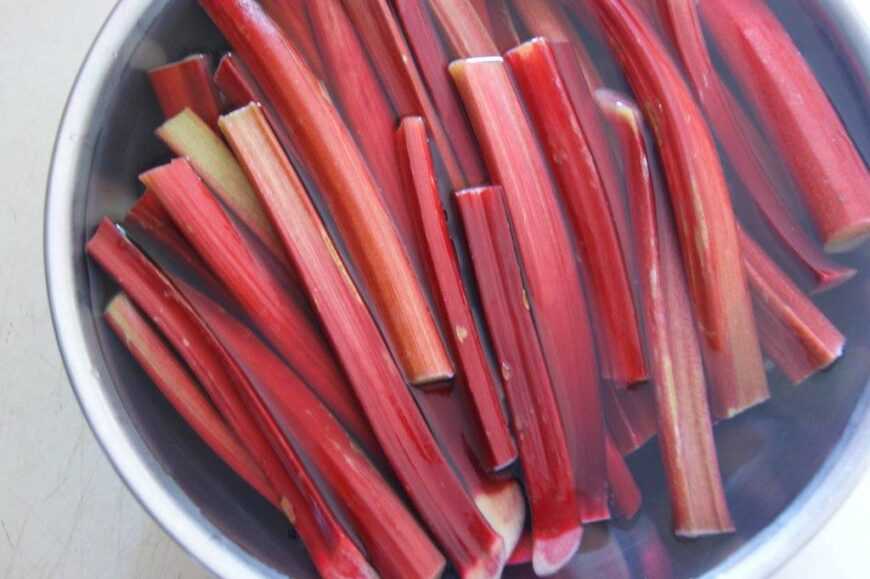 - Почистить вымытые стебли ревеня и порезать на небольшие куски.