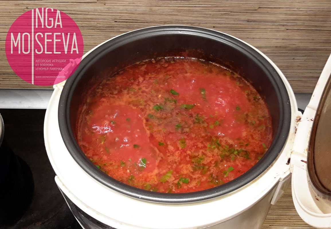 - Когда все помидоры превращены в пюре, переливаем его в чашу мультиварки, включаем режим Жарка или Выпечка на 1,5 часа. Крышку не закрываем, чтобы лишняя влага лучше уходила. Пускай томатное пюре хорошенько прокипит.