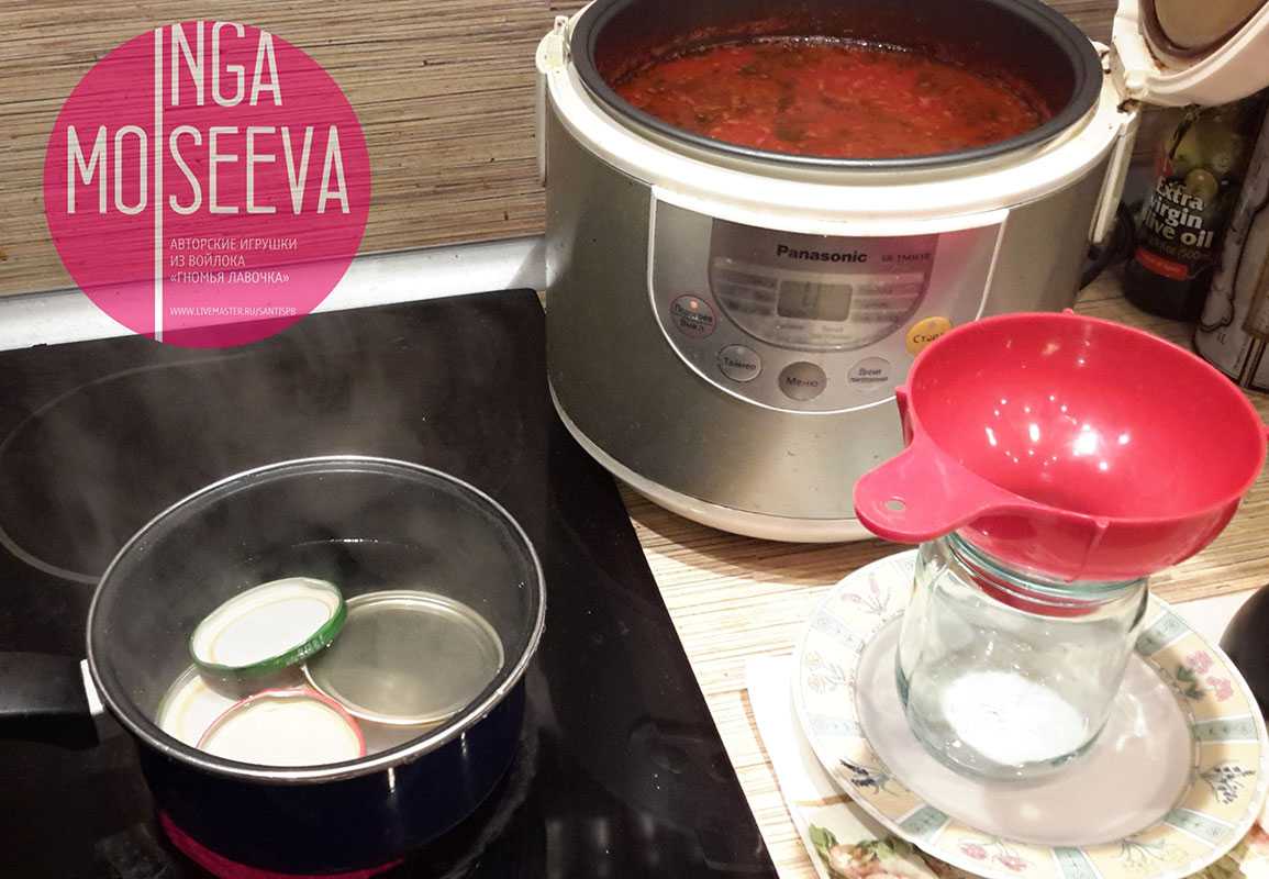 Ровно в 0 у нас все готово к завершающей стадии консервации: мультиварка остается в программе подогрева, стеклянные банки высохли после стерилизации, крышки, наоборот, лежат в кипятке.