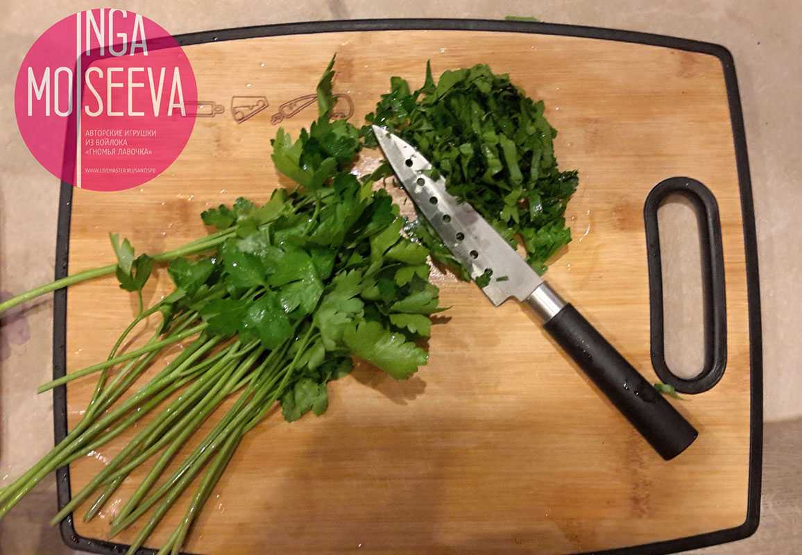 Нарубим ножом пучок петрушки, как листья, так и стебли. Постарайтесь стебли порубить помельче, самые грубые части лучше выкинуть.