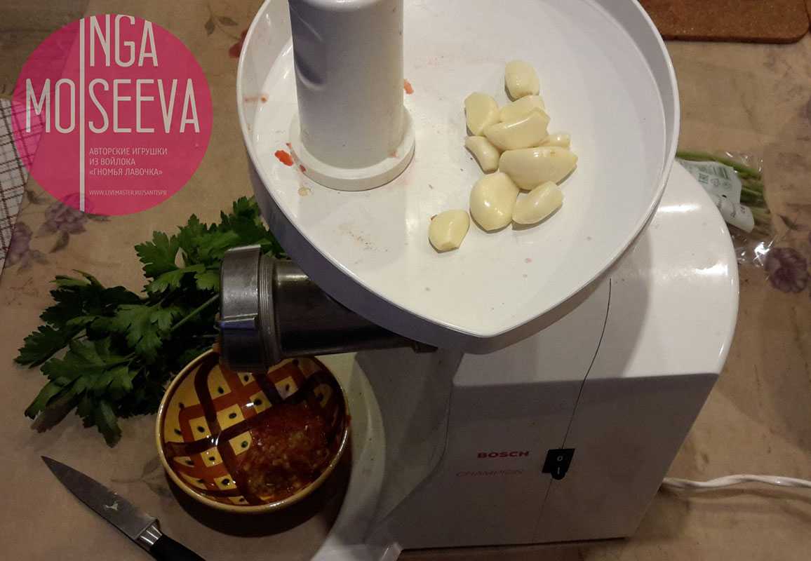 Также мы должны успеть почистить и пропустить через мясорубку весь чеснок, вместе с перчиком чили, если вы его используете.