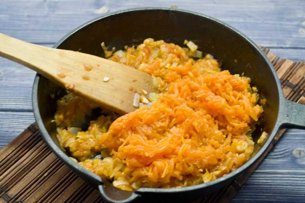3. Хорошо разогреваем сковороду, вливаем туда постное масло, на котором будем обжаривать лук до прозрачности. Затем в зажарку выкладываем морковь, заправляем все солью и молотым перцем. Хорошо перемешиваем овощи, закрываем и тушим до готовности, не забывая периодически помешивать их.