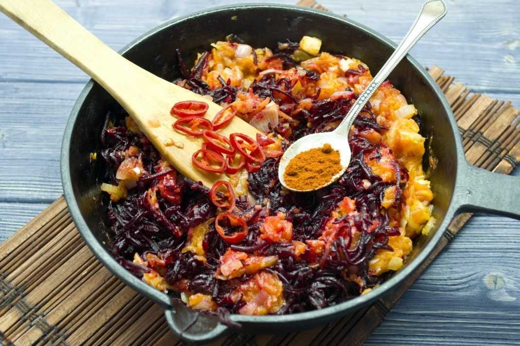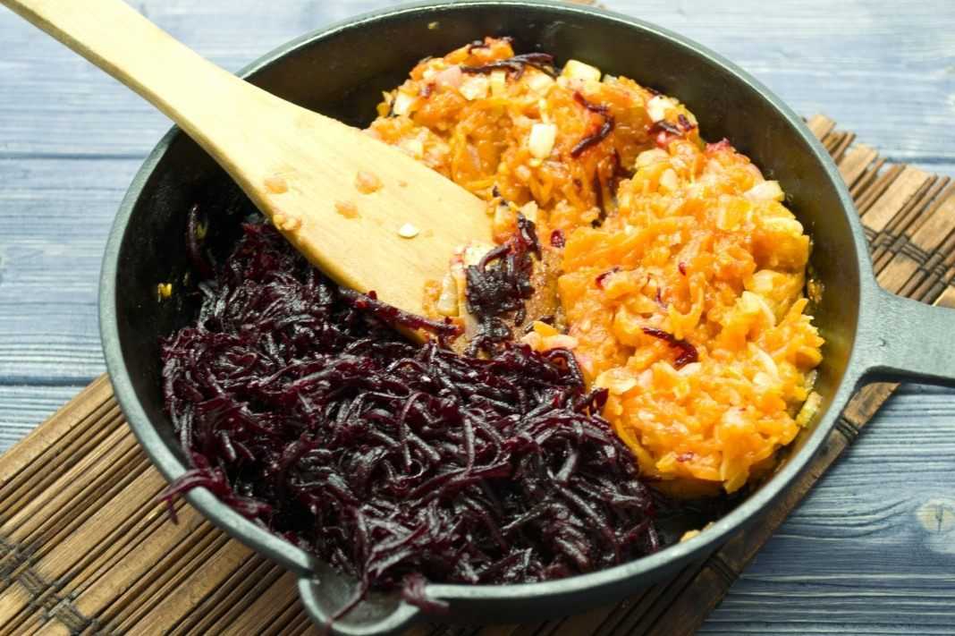 Готовую свеклу и морковку очистите от кожуры, натрите и отправьте к овощам. Готовьте еще 5 минут.