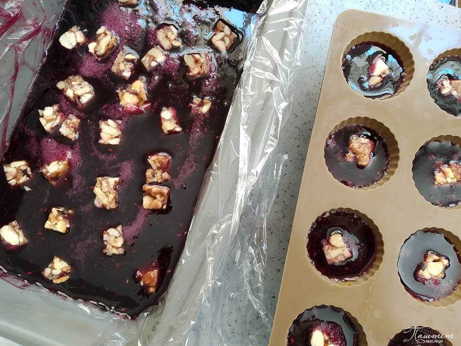 Шаг 5: разливаем мармелад по формам. Я использовала силиконовые для конфет и выпечки. В центр каждой формы кладем по орешку. В форме большого размера распределяем их равномерно. Как я уже писала выше, я использовала не орехи, а нарезанные на кусочки протеиновые батончики.