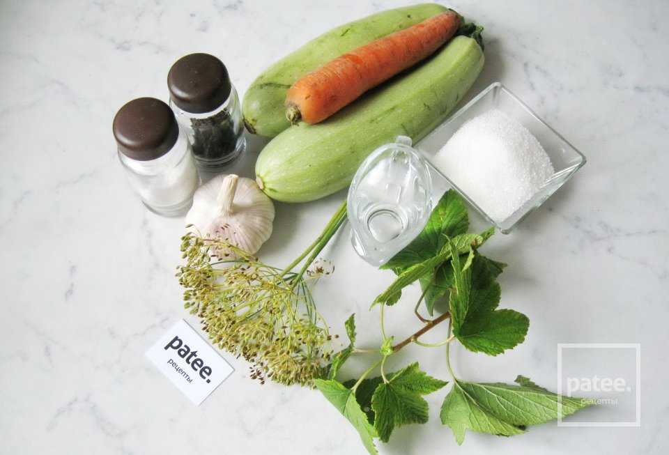 Для приготовления маринованных кабачков с морковью потребуется: кабачки, морковь, сахар, соль, уксус 9%, укроп зонтичный, листья хрена и смородины, чеснок, перец черный горошком.