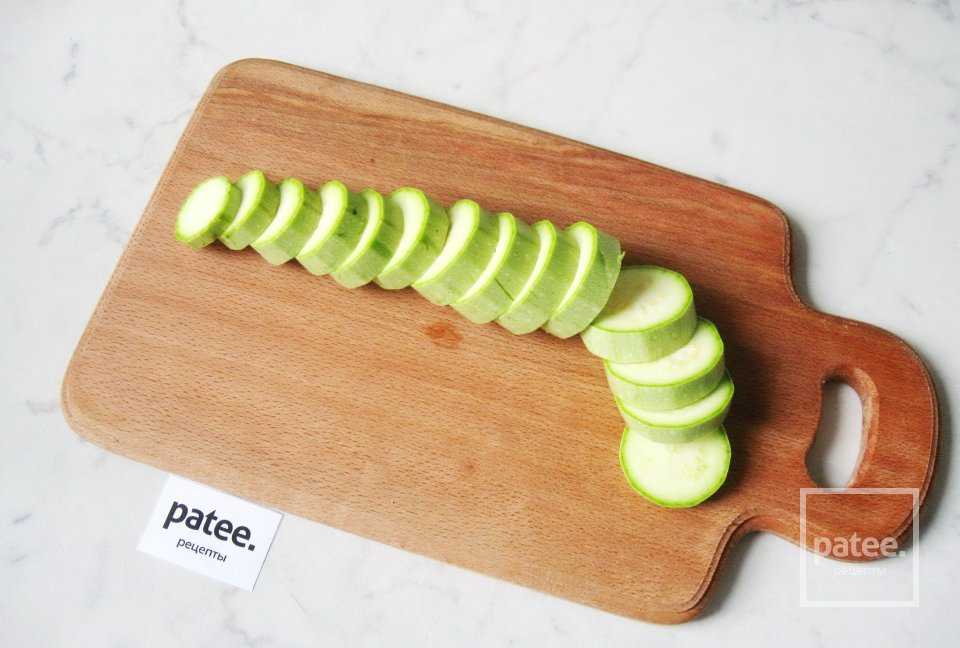 Кабачки нарезать кружками шириной 0,8-1 сантиметр.