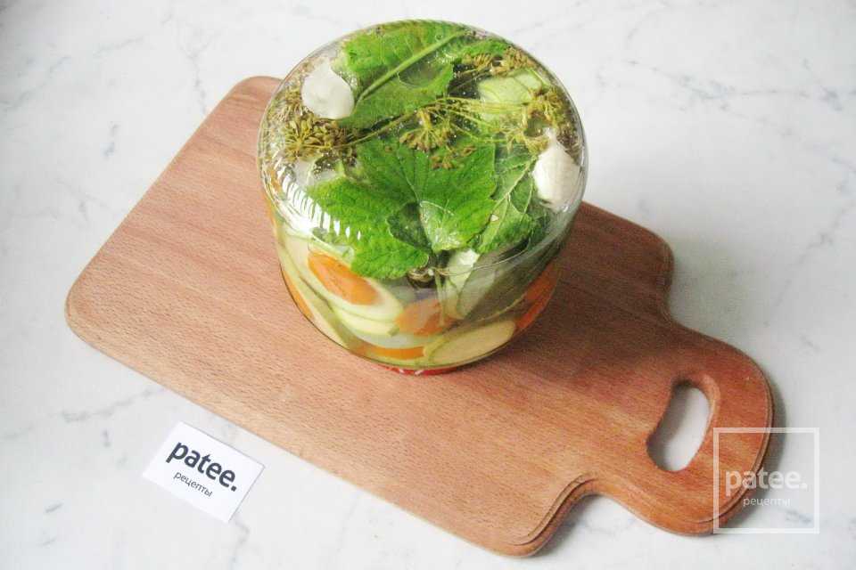 Спустя указанное время кабачковую заготовку следует плотно закрыть крышкой и переместить в холодильник для дальнейшего хранения.