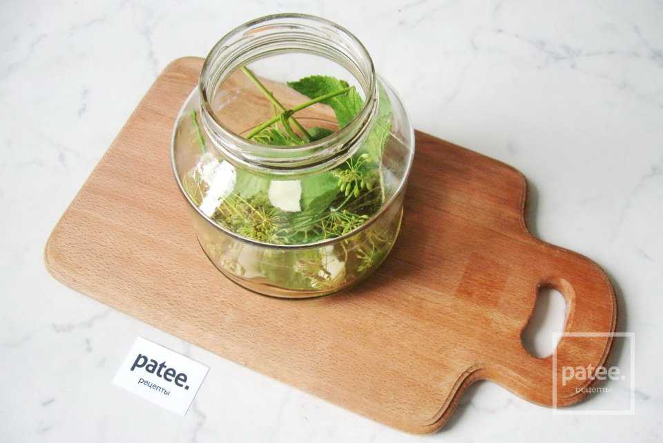 На дно банки выложите лист хрена, лист черной смородины, укроп, чеснок и черный перец горошком.