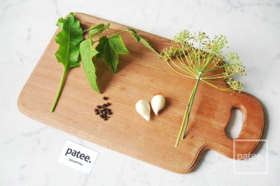 Листья хрена, смородины, укроп и чеснок помыть. Подготовить перец черный горошком. Специи берите по своему вкусу. Любители остренького могут добавить жгучий перец.
