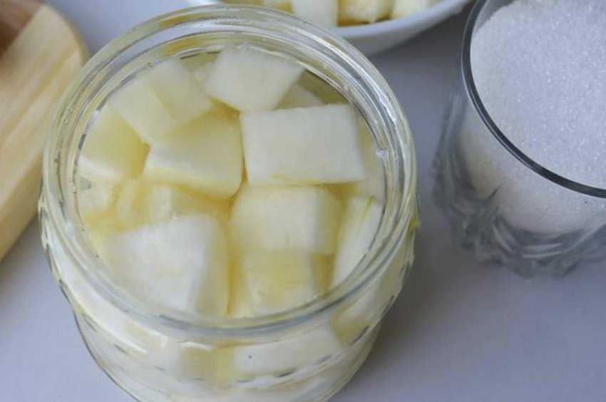 - Уложить кусочки дынной мякоти в сухие простерилизованные баночки.