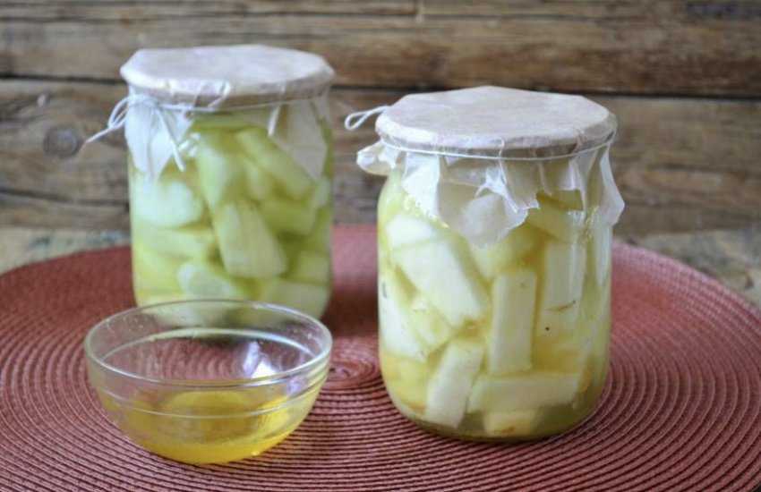 Заготовки закатывают, переворачивают, накрывают толстым пушистым полотенцем. На следующий день банки относят в прохладное сухое место. Если все сделано правильно,то маринад будет прозрачным, а дынные кусочки – целыми.