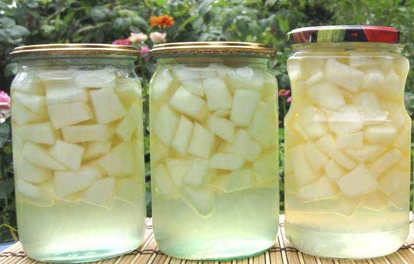 - Порежьте на кусочки дыню, подержите 4 минуты в кипятке и охладите быстро под проточной водой. Упакуйте по баночкам.