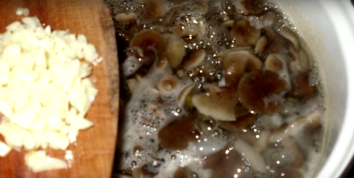 За 5 минут до окончания добавляем к грибам мелко нарезанный чеснок.