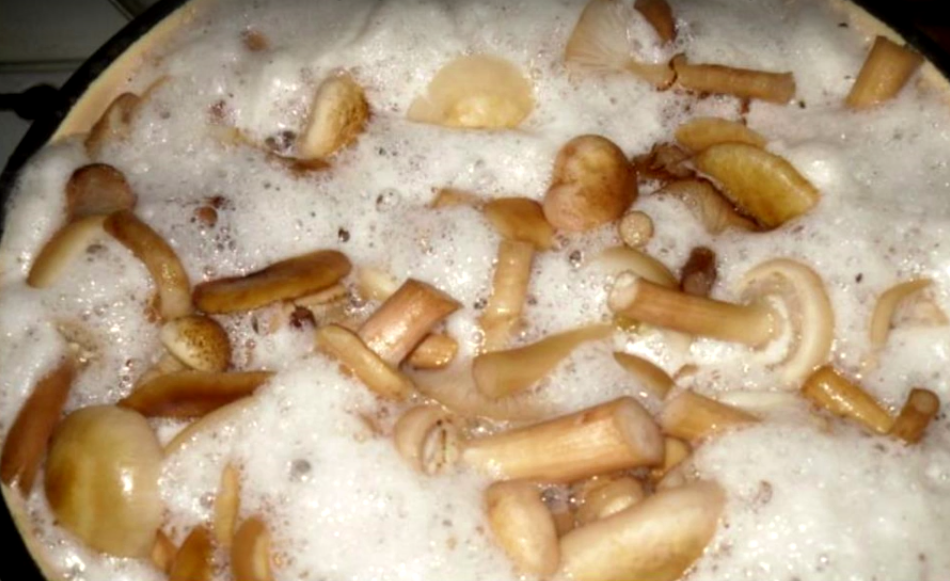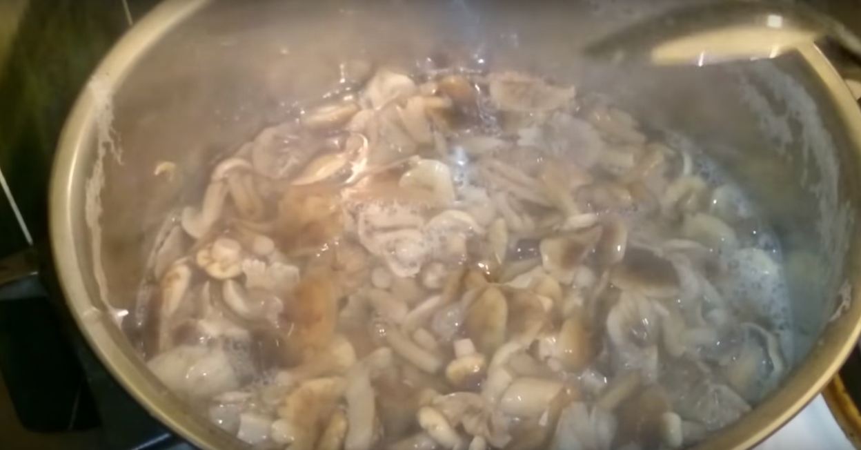 - Вскипятить воду, добавить в нее соль. Опустить помытые грибы, отваривать в течении 20 минут, постоянно снимая пену.