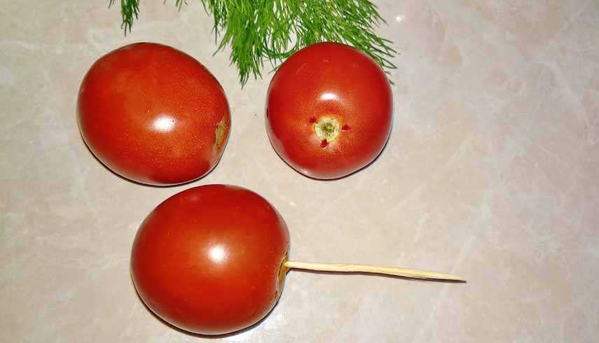 - Не крупные, но плотные томатные плоды хорошо помыть и в области плодоножки зубочисткой сделать 3 отверстия, чтобы при термической обработке они не лопнули.