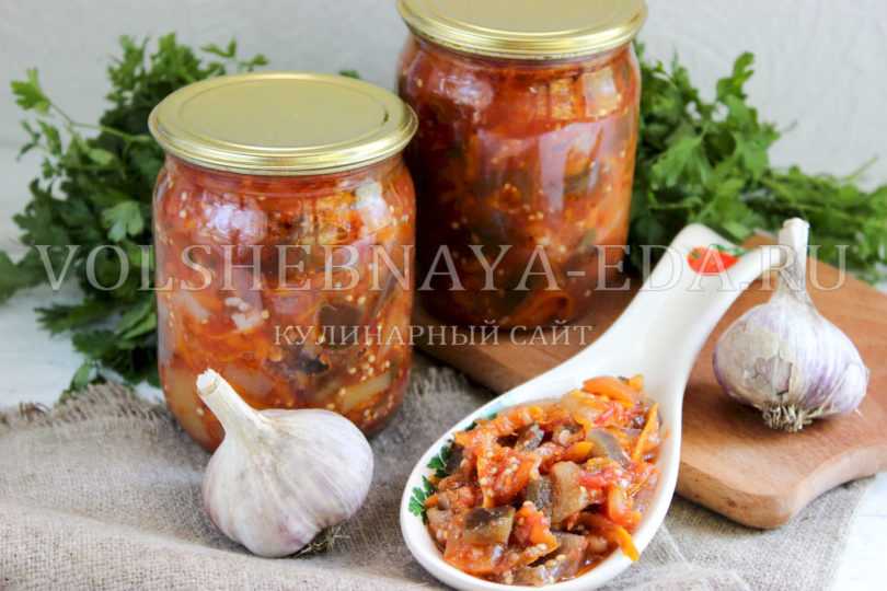 Баклажаны и лук совмещают, обжаривая овощи в течение 5 минут, после чего добавляют перец и удерживают еще 5 минут. В емкость вводят томатную смесь, соль, перец и сахар. Тушение овощной смеси происходит в течение 30 минут, после чего добавляется уксус и измельченный чеснок. Консервация раскладывается в заранее простерилизованные банки.