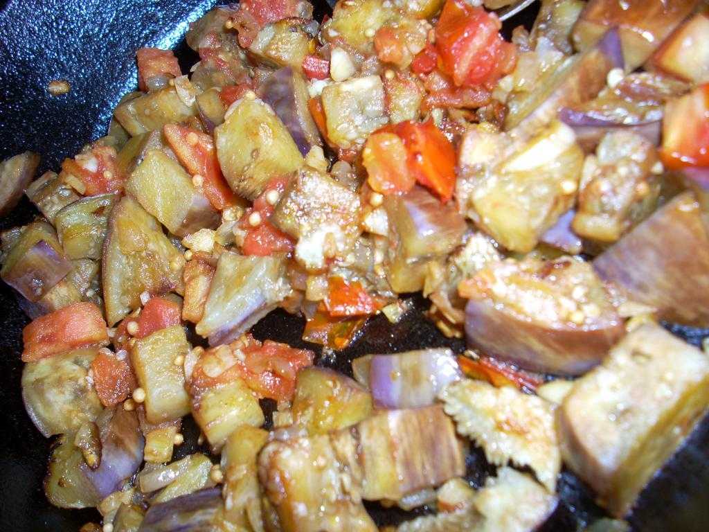 По истечении отведенного времени в соте нужно добавить порезанные баклажаны и, перемешав, продолжить процесс приготовления до достижения состояния готовности последнего ингредиента (около 20-25 минут).