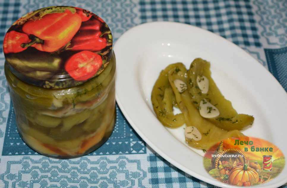 На дно стерилизованной банки выложите мелко нарезанный укроп, чтобы он покрывал все дно. Затем положите измельченный чеснок, но только ½ часть. Выложите в банку кусочки перца, заполните ими почти весь объем. В завершении выложите вновь слой укропа с чесноком и залейте горячим рассолом.